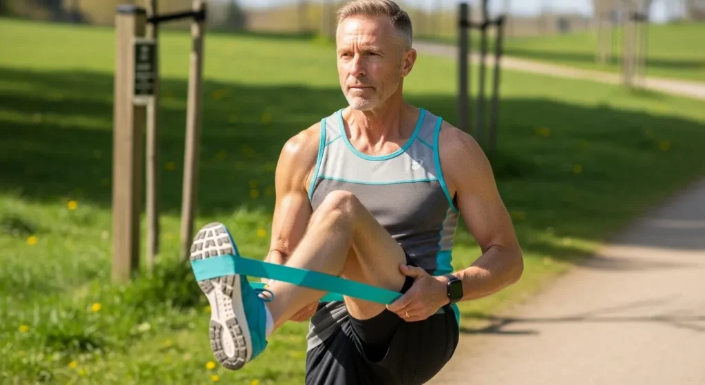 Commencez par 30 secondes d’échauffement circulaire des hanches. Enchaînez 90/90 stretch, Band Hip Distraction, Cossack squat, T-Hip Opener, puis terminez avec 60 secondes de glute bridge. Cette activation finale des fessiers stabilise la hanche dans le mouvement. Les recherches en biomécanique sportive démontrent une activation musculaire accrue de 42% après cette séquence.