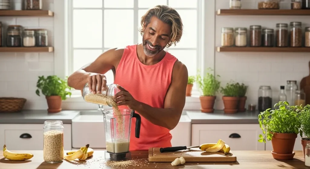 50 g de flocons d’avoine apportent 35 g de glucides complexes. Leur index glycémique bas (55) stabilise votre glycémie. Ajoutez 130 g de banane pour 34 g de glucides supplémentaires. Complétez avec 4 dattes medjool : 13 g de glucides naturels. Total : 82 g de glucides pour 55% de vos calories.