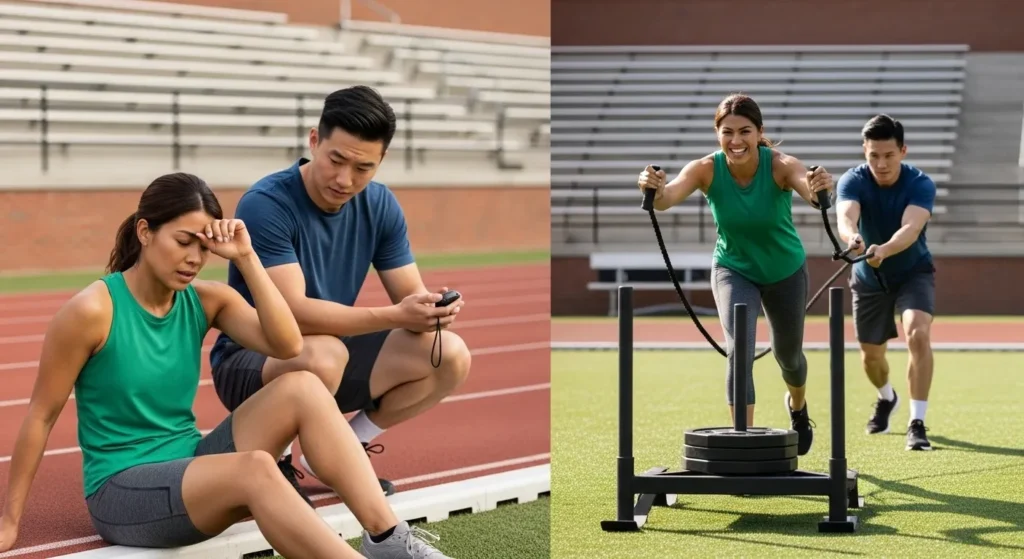 La combinaison force-endurance sollicite davantage de groupes musculaires simultanément. Le sled push engage le haut et le bas du corps. Les wall balls mobilisent les jambes, le tronc et les épaules. Cette sollicitation globale augmente la dépense énergétique de 22% comparée à la course à intensité équivalente selon les études récentes.