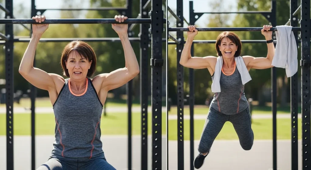 Première action : presser la barre vers le bas. Bras tendus. Épaules actives. Les coachs sportifs certifiés avec diplômes BPJEPS recommandent 10 à 15 secondes de maintien isométrique. Vous sentez vos dorsaux s’engager. Cette pression crée l’élan nécessaire. Ne tirez jamais. Poussez vers le bas.