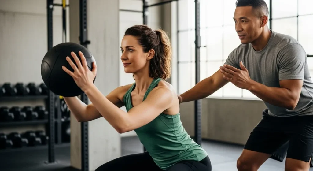 Commencez avec des séries courtes de 8 à 12 répétitions. Utilisez un poids léger de 3 à 6 kg. Focalisez sur la profondeur du squat sans vous préoccuper de la hauteur du lancer. Les coachs sportifs certifiés avec diplômes BPJEPS recommandent 3 séries avec 60 à 90 secondes de repos. Progressez vers des séries de 15 répétitions en 4 à 6 semaines.