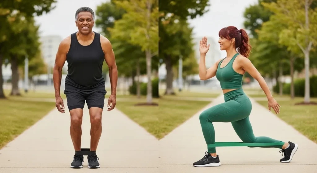 Le pont avec extension de jambe renforce la chaîne postérieure en position fonctionnelle. Allongé sur le dos, une jambe fléchie, l’autre tendue, soulevez le bassin vers le haut. Gardez les abdominaux gainés pour protéger le dos. Effectuez 3 séries de 15 répétitions par jambe en 2 minutes par série. La marche latérale avec bande élastique à 15 € active les abducteurs de hanche sur 3 séries de 20 pas dans chaque direction.