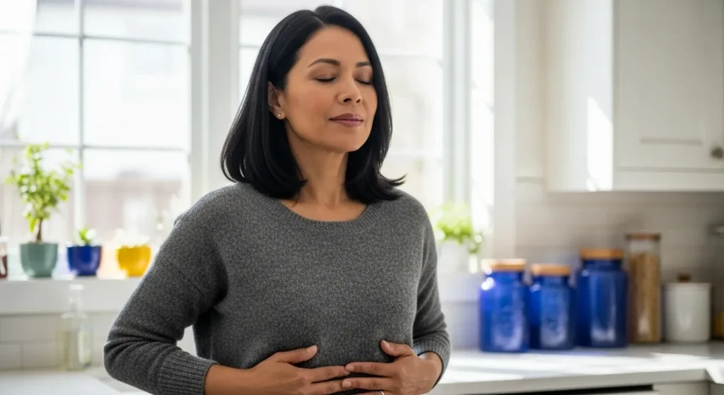 Enchaînez avec la pression sur le sternum. Placez quatre doigts au centre de votre poitrine, appuyez fermement pendant 10 à 30 secondes en respirant profondément. Les professionnels des soins gériatriques observent que cette stimulation directe du nerf vague réduit l’anxiété de 20 à 30% chez les patients seniors. Simple, discret, efficace même au bureau.